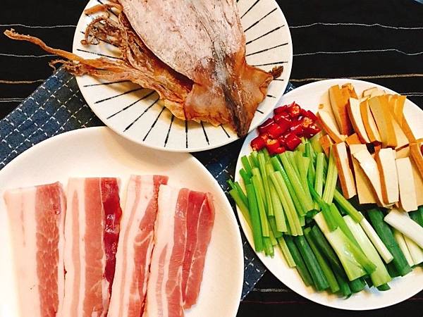 今天要完成這道客家美食要準備的食材有韭菜、豆干、辣椒、蒜苗、魷魚、還有影響客家美食關鍵美味最重要的三久五花肉,調味料的部份要準備的是醬油跟白胡椒。首先,將所有食材清洗過切段處理後做為料理客家美食備用。