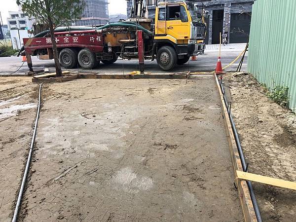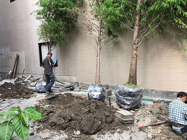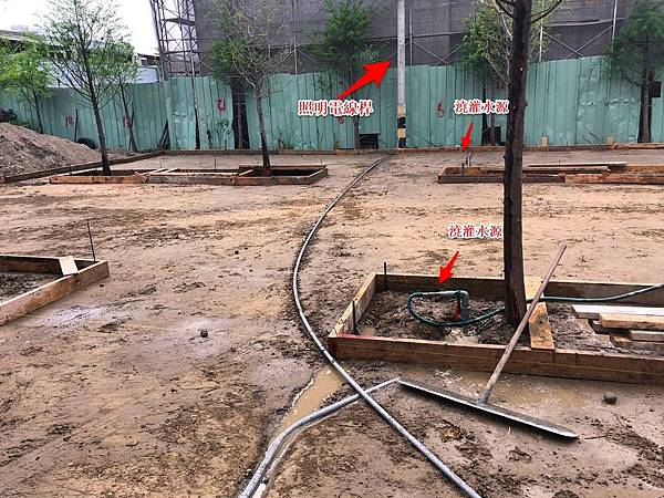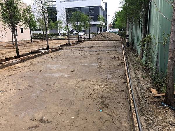 在灌漿之前,將地面澆濕,並將落雨松旁邊用模板把樹木圍起來,讓樹根是長條型。之後配置水源、水電、照明的管線,總共配置三根電線桿和三處的照明,還有多處的澆水的水源。