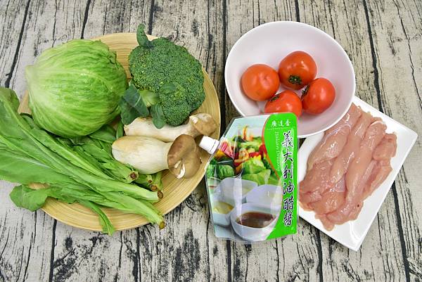 準備材料:雞肉、杏鮑菇、番茄、花椰菜、綠色蔬菜隨意